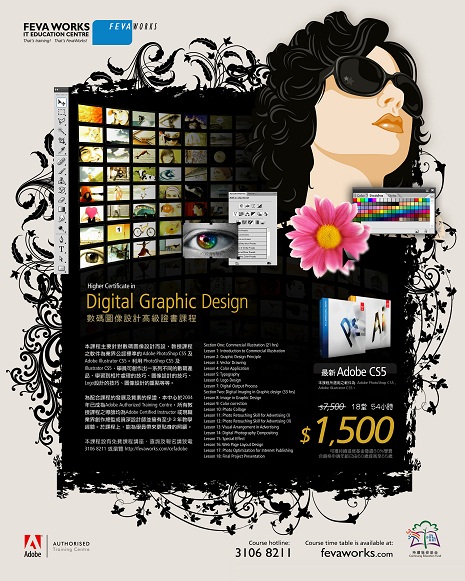 本課程主要針對數碼圖像設計而設,教授課程之軟件為業界公認標準的 Adobe PhotoShop CS5 及 Adobe Illustrator CS5。